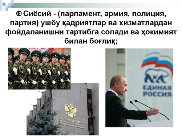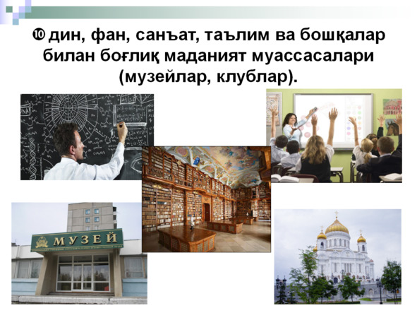 Шу жумладан архитектурадан. Коллектив тузилмалар – бу маълум одамларнинг онгида қисман ҳақиқатан ҳам мавжуд бўлган ва аҳамиятли бўлиши керак бўлган маълум ғоялар.