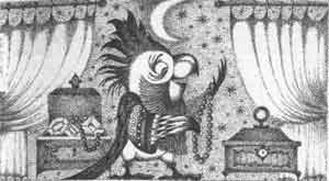 Таким манером каждую ночь жена купца собиралась пойти к юноше, пламя страсти в ней разгоралось, и она шла к попугаю посоветоваться и получить разрешение. Он же отвлекал ее сказками и легендами и как бы, между прочим, давал ей советы и назидания, так что вся ночь проходила в беседе. И красотке к утру ничего не оставалось, кроме как отказаться от своего намерения.