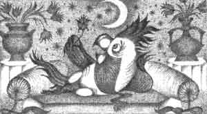 Попугай, видя, что страсть возобладала над ней, что она жаждет свидеться с возлюбленным, поцеловал прах в знак покорности, ударил в землю челом рабского служения, а потом сказал: