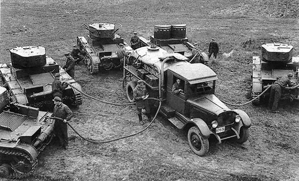 Одновременная заправка пяти Т-26 трёх разных модификаций – один ранний двухбашенный обр. 1931 г., три однобашенных обр. 1933 г. и один командирский с поручневой антенной