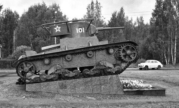 Командирский Т-26. Поднят со дна Финского залива и установлен на постамент в 2005 году. Светлая память одному члену экипажа, он был в поднятой машине