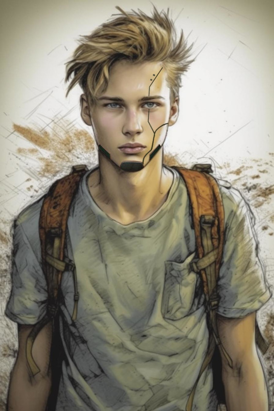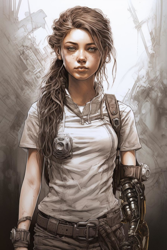 У придорожных кустов стоит девочка, примерно ровесница Васьки. Они даже чем-то похожи – обе курносые, зеленоглазые, светловолосые. Но эта одета в драную жилетку поверх ещё более драной майки, грязные военные штаны и стоптанные ботинки, а лицо её густо перепачкано копотью. Причём, судя по следам от пальцев, копоть эта наносилась специально. На правом плече у девочки здоровенная железяка, похожая на насаженную на стальную трубу алебарду, к которой зачем-то прикрутили сложное электрическое устройство. А ниже левого плеча у неё короткий кусок руки, к которому приделан грубый протез.