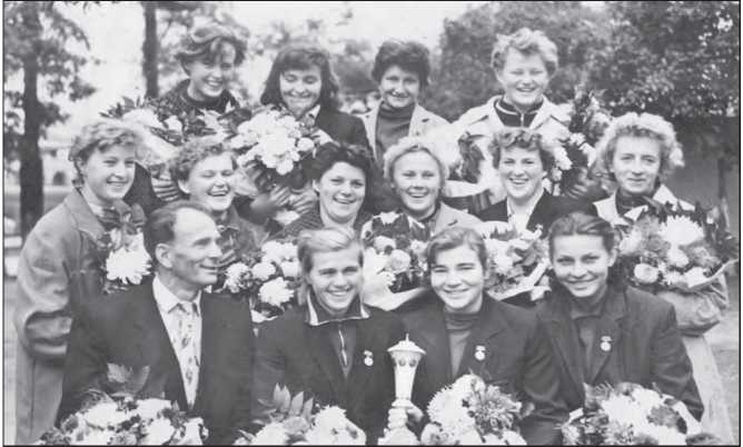 Рис. 1. В первом ряду тренер Альфред Борисович Свидерский, с медалями на груди вратарь Мария Шарикова, капитан команды Валентина Игнатьева, нападающая Тамара Маляренко