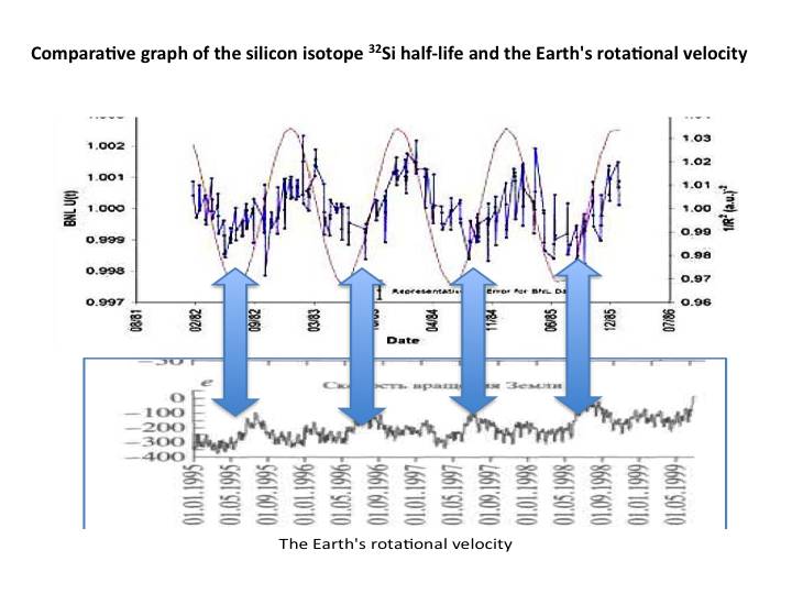 In 2008 the article was published in the US: Jere H. Jenkins, Ephraim Fischbach, John B. Buncher, John T. Gruenwald, Dennis E. Krauseand, Joshua J. Mattes, «Evidence for Correlations Between Nuclear Decay Rates and Earth-Sun Distance». (ArXiv: 0808.3283v1 [astro-ph]). It presents the research results of the silicon isotope 32Si half-life at Brookhaven National Laboratory (BNL) since 1982 to 1986. An annual cycling of the decay process was identified, as well as its correlation with the 1/R2 value, where R is the distance between the Earth and the Sun. But at the same time this is the indicator of the Earth's orbital speed. In winter at perihelion it is maximum (minimal distance to the Sun), whereas in summer at aphelion it is minimal.