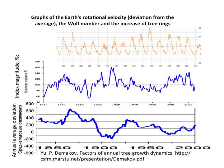 Note that decline in the growth of the tree rings is related to the Earth's rotational velocity, that is, to decline of the gravity-spin energies. Width of tree rings, as well as cereal yield are stronger correlated with the Earth's rotational velocity than with the solar activity in electromagnetic range.