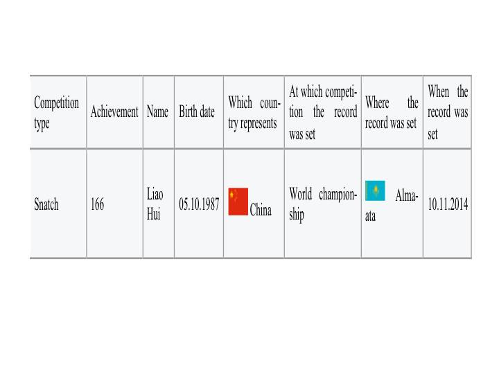 Let's present sample data collected for each athlete on the example of Liao Hui, weight-lifting, weight up to 69 kg.