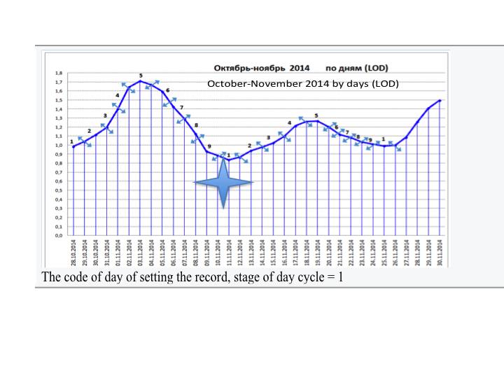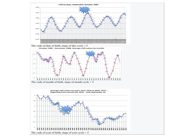 The stage of the maximum LOD values on the scale of individual years is denoted as 5, whereas the minimum ones – as 1. In this case, there might be such a situation: the peak LOD value in the current year is followed by its decline in the next year, and then it soars again. In this case, stages of cycles 3-4 and 7-9 can be observed and denoted only on a monthly data scale. On an annual scale we simply will not be able to denote them in the table and on the graph. The number of years between them is not enough to denote steps 3-4 and 7-9. Hence, percentage of the different stages in the table and on the graph is different.