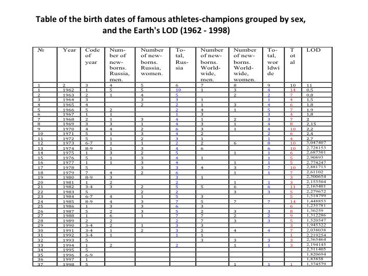 The correlation between the Earth's LOD and the number of born outstanding athletes in Russia (columns 6 and 11) equals -0.45. In Russia, the birth rate of outstanding athletes is strongly related to the Earth's rotational velocity. Most prominent Russian athletes were born during growth of the Earth's rotational velocity. Recall: cereals also grow better thereat.