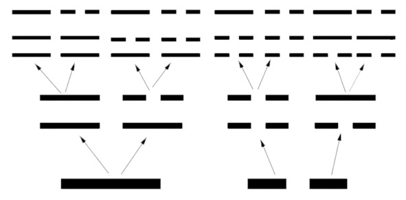 В гексаграмме подвижность линий обозначают дополнительными крестом и кругом на линиях, но эту идею можно отобразить иначе – через удвоение линий. Так из Ян и Инь мы получим четыре символа, которые приведены ниже (рис. 7). Просто над Ян нарисуйте Ян и Инь, и над Инь нарисуйте Ян и Инь. И это уже начало строительства будущей гексаграммы.