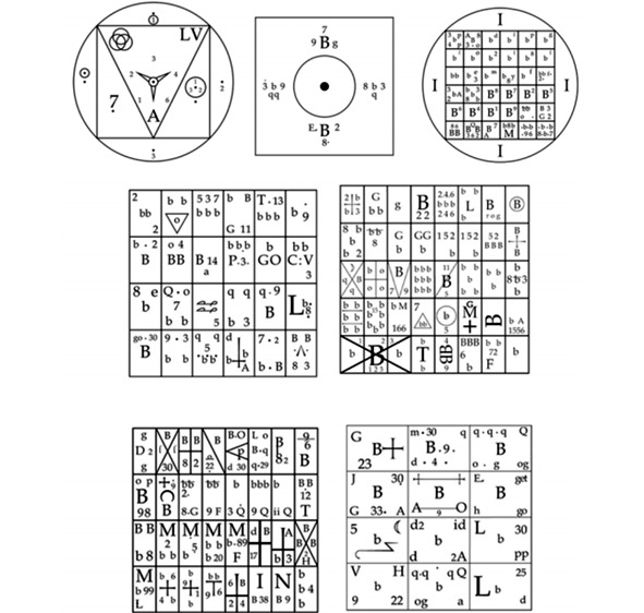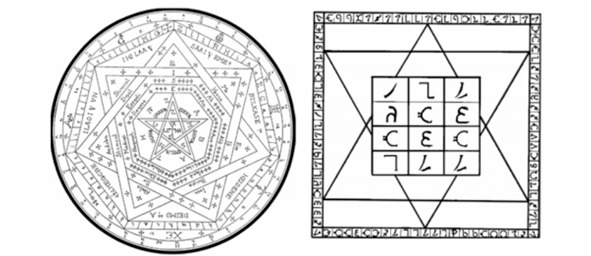 Также были изготовлены Священный Стол, служащий алтарем и Печать Бога Истины. Печать – это восковой пентакль в виде набора звезд и многоугольников, заполненных именами ангелов, полученных из таблиц с буквами имен других ангелов, которые нужно читать по особым правилам и в особых направлениях. И это – типичная Енохиана, магия букв и шифров, головоломок и таблиц, где можно отыскать имена, если знать правила.