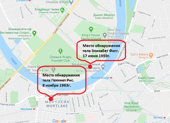 Место обнаружения тела Гвиннет. В некоторых источниках место обнаружения тела показывают немного в другой стороне, но это не совсем верно. Именно на свалке в районе Мортлейк было найдено тело Гвиннет Рис.