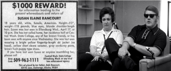 Слева – постер с информацией о вознаграждении в размере 1000 долларов за сведения о местонахождении Сьюзан Ранкорт; справа – Вивиан и Дейл Ранкорт, родители пропавшей Сьюзан.