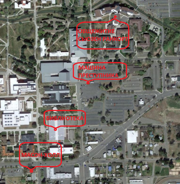 На фото видно расположение Масон-холла, библиотеки, парковки, где была припаркована машина мужчины с перевязанной рукой и студенческие общежития.
