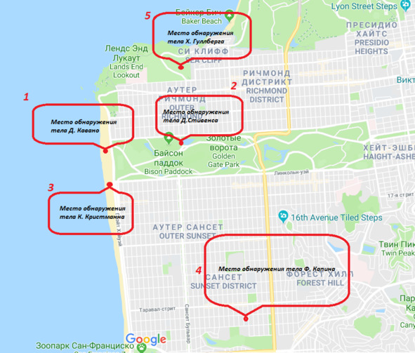 На карте прекрасно видно, что первые два тела жертв связаны со знаменитым «Золотым парком «Сан-Франциско.