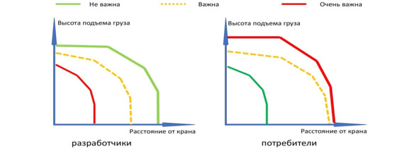 Разработчики – квалифицированные специалисты КБ завода вместе с маркетологами полагали (рисунок слева, красным цветом), что важнее всего максимальная грузоподъемность крана. Это грузоподъемность на минимальном вылете стрелы, рядом с самим краном, максимальный вес, который гарантированно, даже с запасом, выдерживает конструкция.