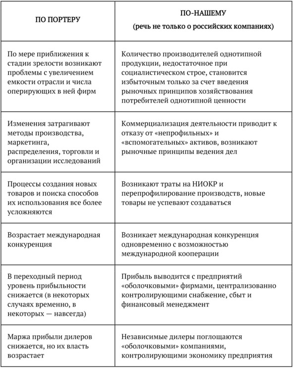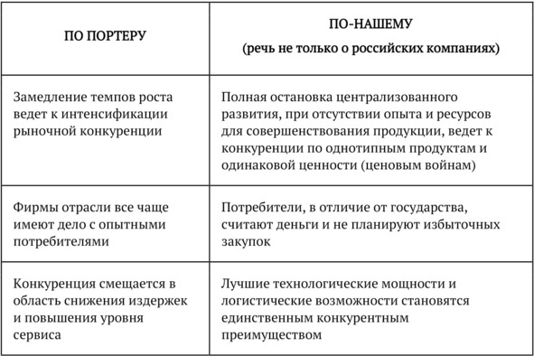 Поскольку российская экономика в тех отраслях, которые не монополизированы, постоянно находится в стадии «отраслевой зрелости», стоит отдельно остановиться на этих вопросах. Отраслевая «зрелость» по-российски отличается от описанной и исследованной г-ном Портером ровно в силу того, что наши предприятия развивались одновременно, планово (были отраслевые приоритеты: оборонные, промышленные, сельскохозяйственные и т.д.). К возникновению рыночных отношений предприятия одной отрасли подошли с примерно одинаковыми структурами издержек, одинаковыми технологическими мощностями, одинаковыми поставщиками и потребителями, а самое главное, с одинаковыми продуктами – носителями одинаковой ценности и соответствующего отношения.