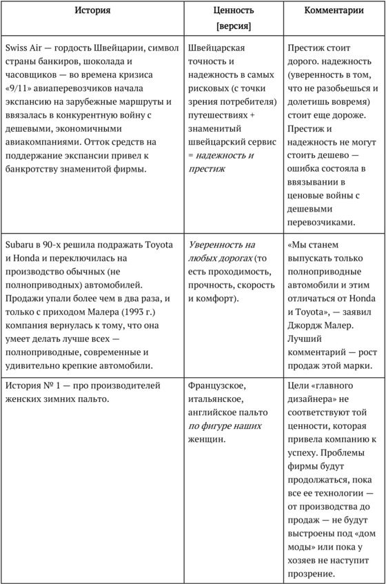 «Ценность товара/услуги может быть определена только конечным потребителем. Ценность создается производителем. С точки зрения потребителя, именно ради этого производитель и существует. Тем не менее по ряду причин производителю очень сложно точно определить, в чем состоит ценность товара или услуги… Больше всего людей беспокоит конкретный продукт, который, как полагает производитель, потребитель должен приобрести по определенной цене и тем самым продлить срок существования фирмы на рынке, а также способ, которым можно улучшить качество продукции и повысить эффективность производства при одновременном стабильном снижении основных составляющих затрат», – пишут авторы.
