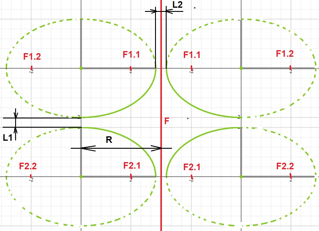 Образующий профиль: Зеркальное размещение двух четверть сегментов эллипсов относительно вершин на регулируемом расстоянии L1 и L2.