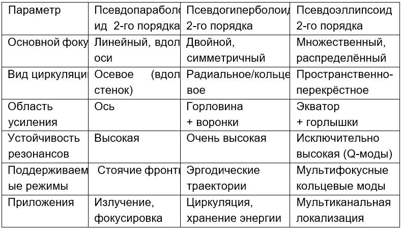 Таким образом псевдоэллипсоид 2-го порядка – это уникальная псевдоповерхность, объединяющая преимущества волновых ловушек, пространственных резонаторов, фокусирующих элементов и распределённых каналов передачи сигнала. За счёт переменной отрицательной кривизны и внутренней многозонной структуры он создаёт условия для тонкой настройки фокусировки, циркуляции, резонансного взаимодействия и локализации волн.