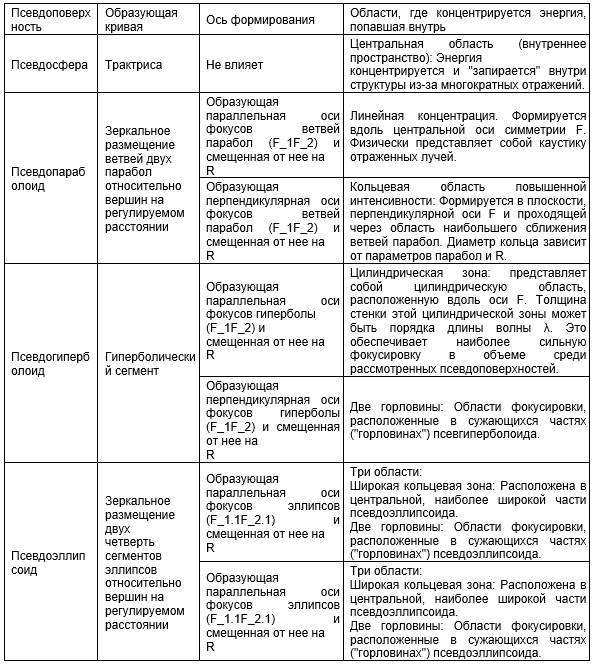 В отличие от псевдопараболоида или псевдогиперболоидов, псевдоэллипсоид может быть, как замкнутым, так и открытым объектом, обладая уникальной топологией, позволяющей концентрировать, направлять и перераспределять волновую энергию одновременно в нескольких фокусных (или квазифокусных) зонах, соединённых скрытой геометрической обратной связью.