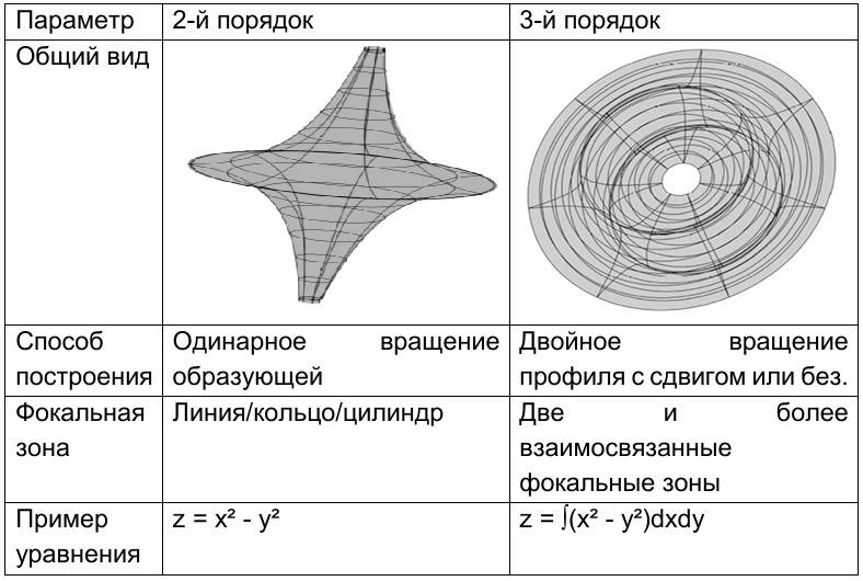 Главной чертой псевдоповерхностей порядка 4+ является сочетание высокой регулируемости кривизны и появление "внутренних слоёв" геометрической логики: перегибов, вложенных фокусных камер, фрактальных зон и мультиосевых структур. В них геометрия начинает выполнять роль не просто средства управления волной – а распределённой многозадачной вычислительной схемы.