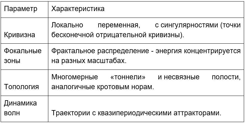 Кривизна (K) может меняться не только по координатам (r, z), но и по частоте входной волны (K = K(r,z,L)), что означает частотно-зависимую геометрию. Появление пножества мультифокусных структур концентрации энергии. Метрика отдельных участков может быть изометрична гиперболическим плоскостям, но соединена через переходные области с переменными шкалами.