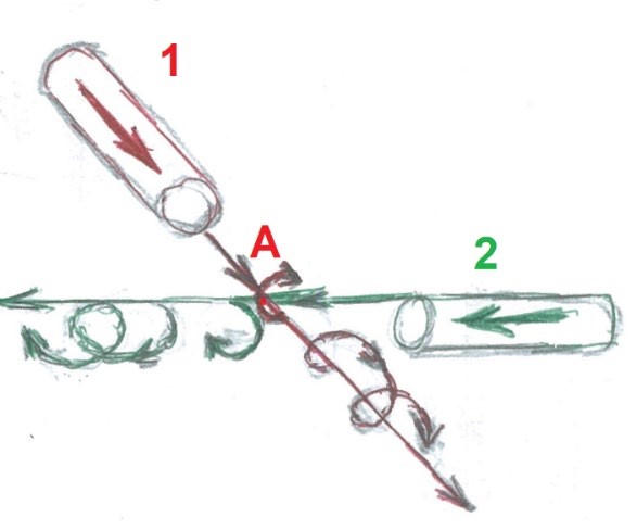 Принцип работы коаксиально-ленточного завихрителя основан на следующем. Каждому множеству из двух относительно линейных потоков в каждом месте их общего диаметрального пересечения придаётся небольшая крутка. Согласно рис. № 3, в общей точке (А) пересечения касательных двух потоков (1) и (2) формируется тангенциальная составляющая в каждом потоке.