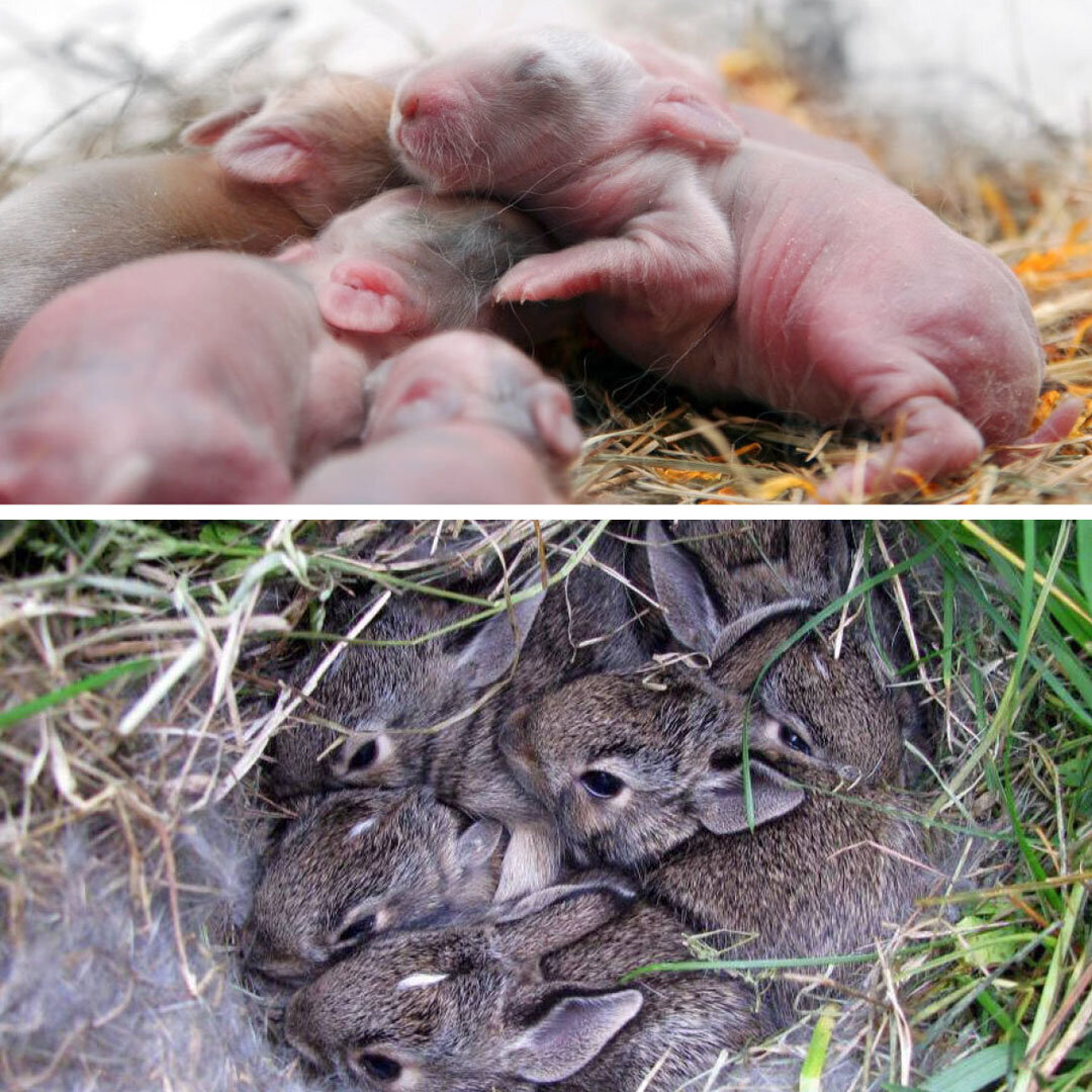 По такому же пути пошло биологическое развитие кроликов, когда недолгая беременность заканчивается рождением слепых голых детенышей, выращивание которых производится в гнезде норы, как в искусственной матке.