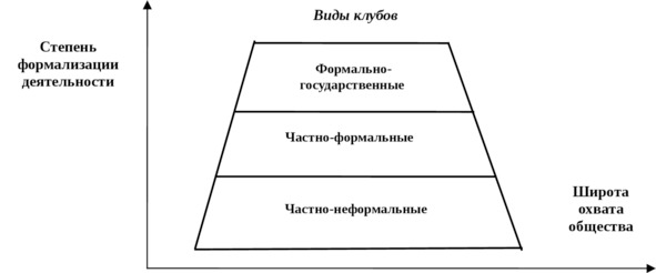 Подводя итог, можем констатировать, что к 80-м годам ХХ века в СССР сложилась определенная иерархическая система клубов, которую можно представить следующим образом (см. рис. 2) [48, с. 141]. На вершине усеченной пирамиды (расширяющейся книзу) находятся формально-государственные клубы, средний уровень представлен частно-формальными, а на самом нижнем ярусе расположились частно-неформальные клубы.