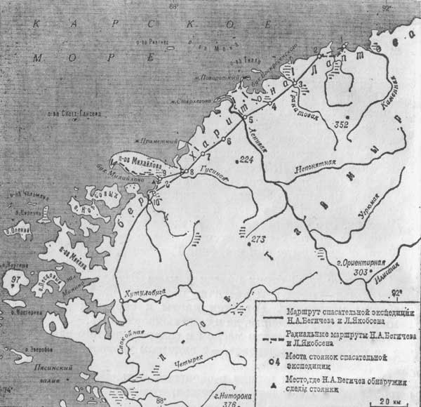 Карта работ спасательной экспедиции Н.А. Бегичева и Л. Якобсена