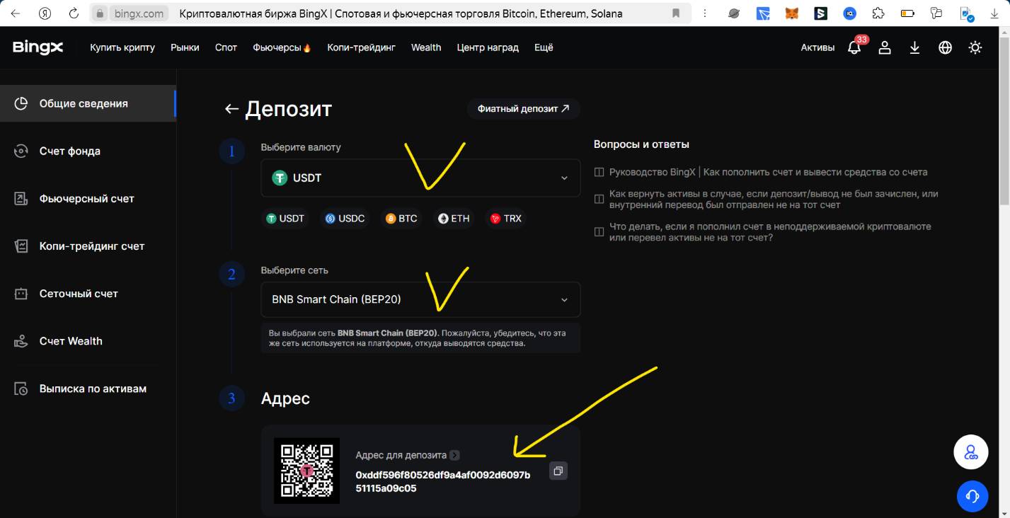 В моём случае, я выбрал USDT и указал сеть BEP-20 (от BSC-сети). Очень важно смотреть не только на название криптовалюты, но и на сеть пополнения!!! Если вы отправите правильную криптовалюту, но не по правильной сети блокчейна (например, вместо TRC-20 через BEP-20), вы можете навсегда проститься со своими средствами. Это не шутки – будьте внимательны!!!