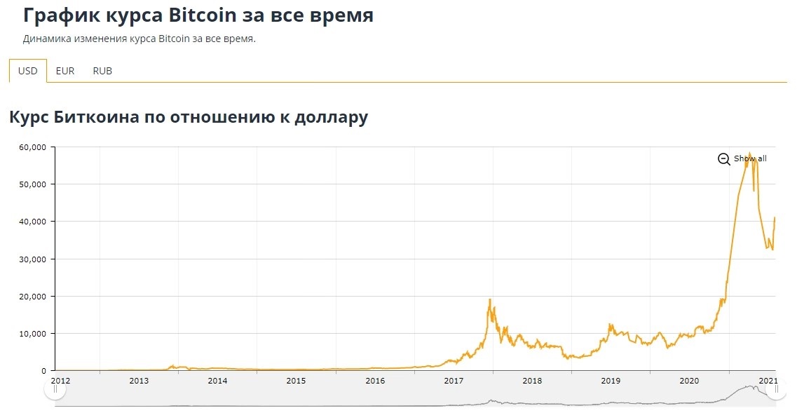 сентябрь 2021 и далее – смотрите в режиме реального времени. На 22 октября 2021 года биткоин был на отметке в 62 400 долларов с копейками, но всё это очень сильно меняется. 20 ОКТЯБРЯ 2021 БИТОК ВЗЛЕТЕЛ ДО 67 000 ДОЛЛАРОВ – ТО ЛИ ЕЩЁ БУДЕТ!