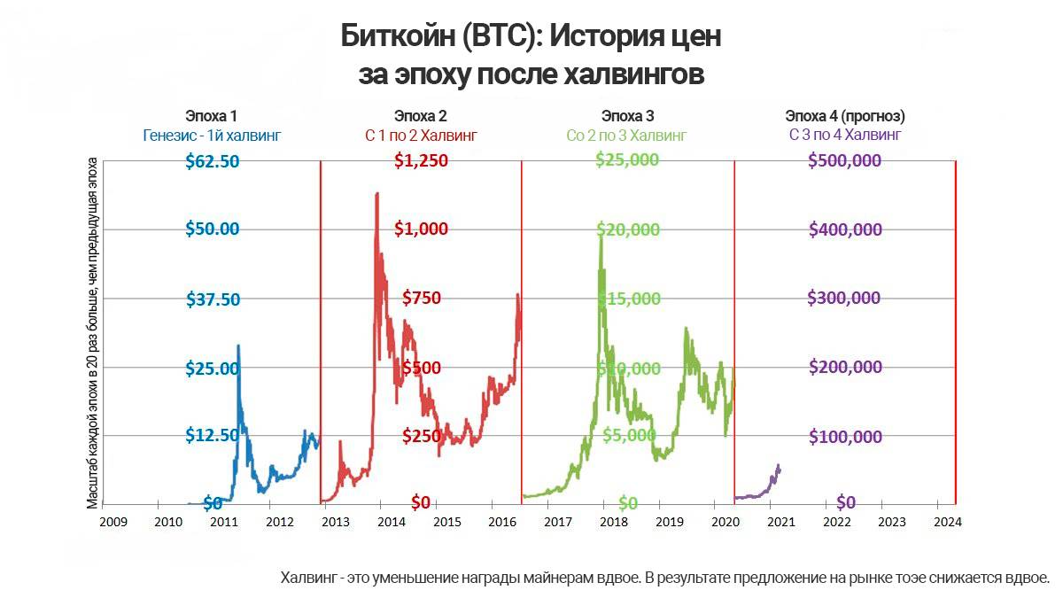 Четвертый халвинг ожидается в 2024 году – на момент написания книги, оставалось каких-то 2 с небольшим года. Многие аналитики (Захаркин Руслан – в их числе) ожидают цену BTC в диапазоне от 250 000 до 1 миллиона долларов – разумеется, по аналогии с прошлыми халвингами и последующими циклами. Всё развивается по известному сценарию жизни крипто-рынка – скептики считают, что предпосылок для развития рынка просто тупо нет, а крипто-энтузиасты просто двигают тему и зарабатывают деньги.