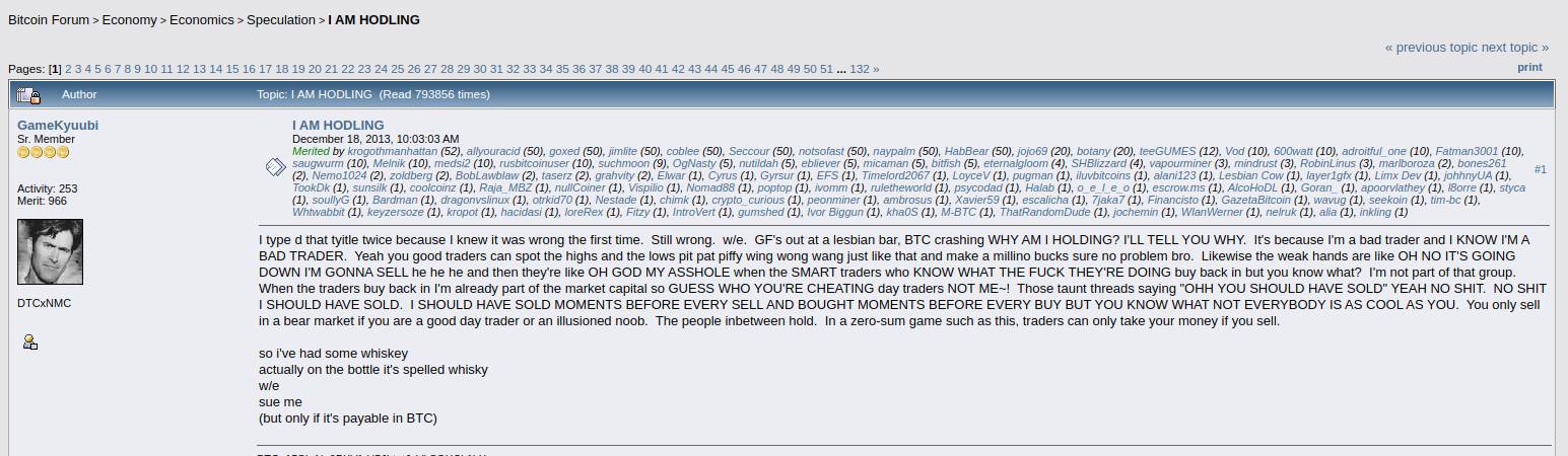 Впервые термин HODL появился в декабре 2013 года на форуме Bitcointalk. Тогда первая криптовалюта поднялась практически до $1100 тыс., но в течение суток обвалилась на 39%.