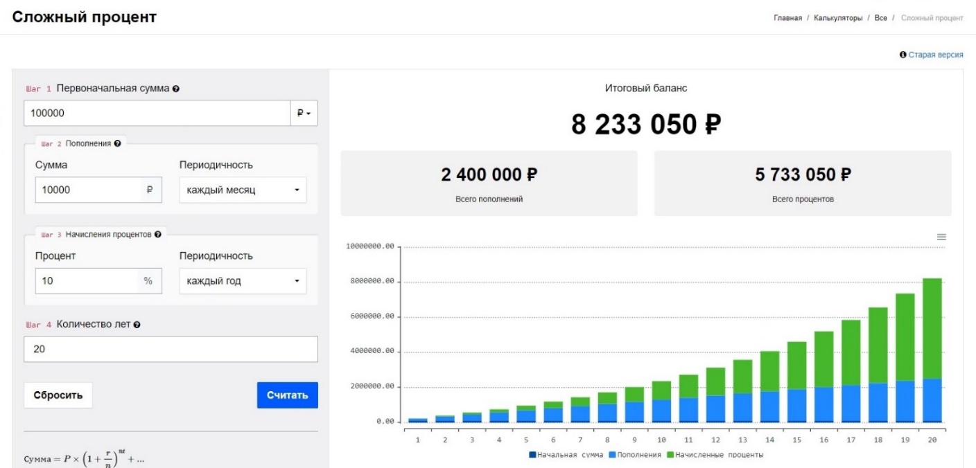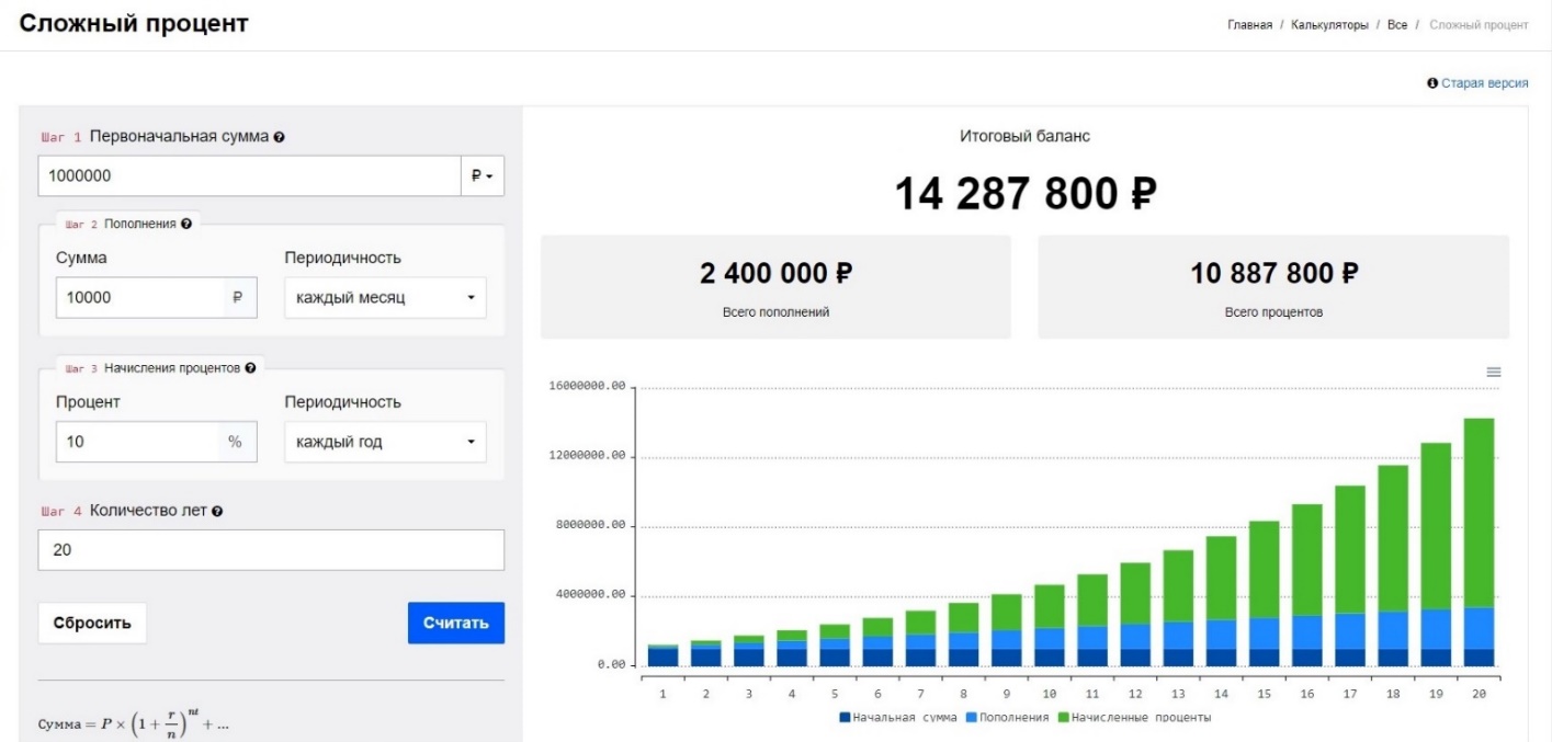 Для тех, кто хочет поиграться с калькулятором сложного процента – вбейте в любом поисковике и Вы сразу же попадёте на более-менее достойные ресурсы.