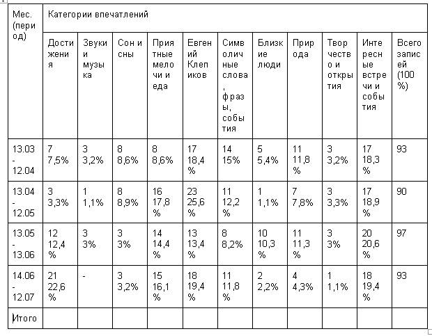 В итоге, все впечатления я разбила на 10 категорий и в процентах посчитала, сколько чего было в моей жизни в каждом месяце – с 13 марта по 13 июля 2015 года.