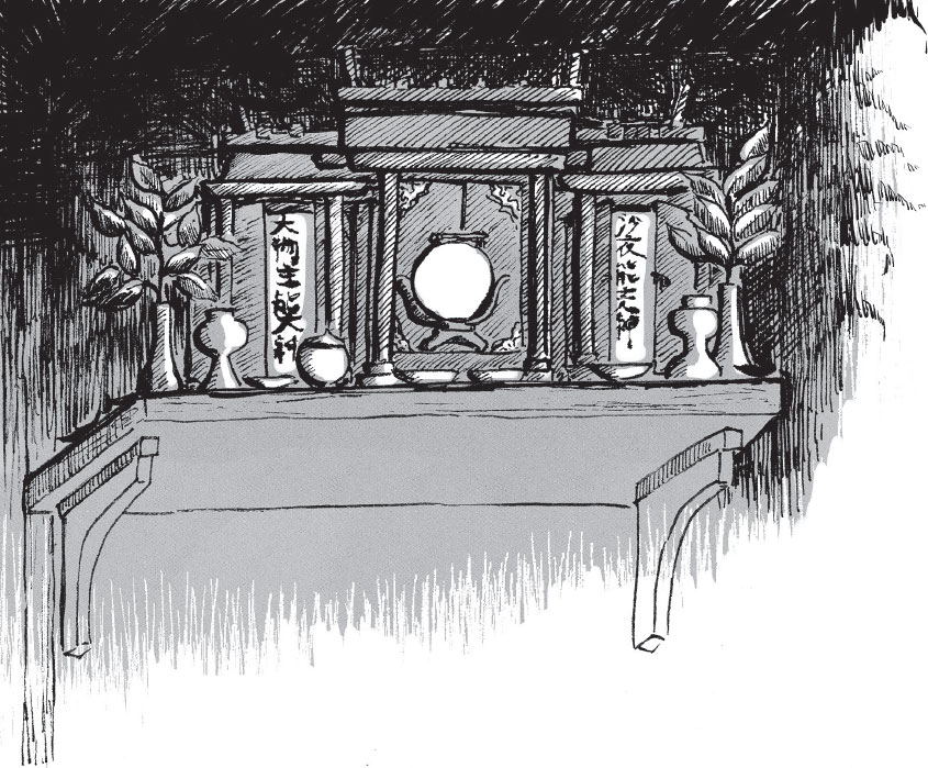В кухне обнаружился отдельный алтарь для бога по имени Коудзин-сан, Хранитель очага. Хайо раскладывала подношения, когда из гостиной явился Мансаку с разными вазами и сосудами, чтобы почистить их и наполнить.