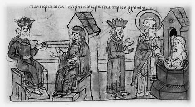 Крещение княгини Ольги. Миниатюра Радзивилловской летописи XIII век (?)