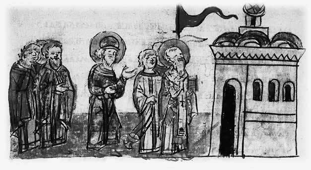 Освящение церкви Богородицы (Десятинной). Миниатюра Радзивилловской летописи. XIII век (?)