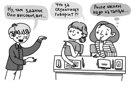 Некоторые рассказчики впадают в другую крайность и начинают рассказывать о себе абсолютно все – вплоть до того, что перед выходом из дома они завязывают шнурки на ботинках.