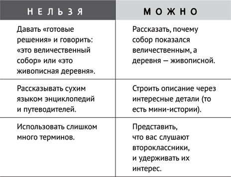 Второклассника мы выбрали не случайно: как правило, в 8–9 лет человеку уже становятся интересны примерно те же темы, что и в 15, 20, 30 или 70 лет. Но объяснять 8-летнему человеку что-то сложное надо понятным языком. И почаще приводить примеры. Вот эти самые примеры и есть детали, которые так нужны историям без сюжета.