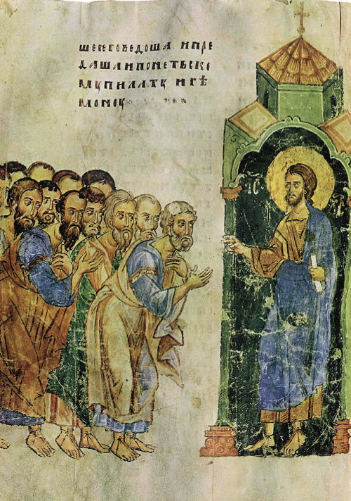 Миниатюра «Христос с апостолами». Библиотека Академии наук. Сийское Евангелие. 1340 г.