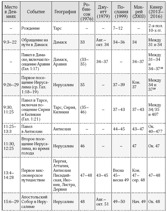 В нижеследующей таблице хронология событий из жизни Павла приведена по пяти источникам: исследованию Дж. Робинсона, посвященному датировке событий, описанных в Новом Завете[33], книге Р. Джуитта «Хронология жизни Павла»[34], изданной Наваррским университетом книге «Послания святого Павла»[35], монографии Дж. Макрея «Жизнь и учение апостола Павла»[36] и комментарию К. С. Кинера на книгу Деяний[37].