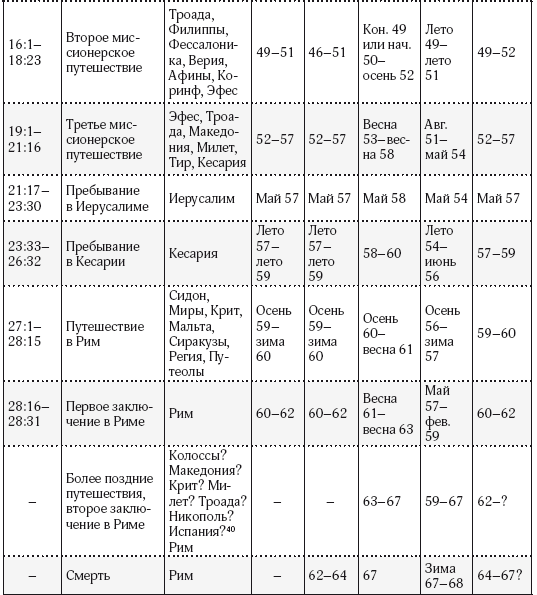 Дальнейшие события жизни Павла датируются на основании совокупности имеющихся данных. Целый ряд ученых датируют время обращения Павла на пути в Дамаск 34 годом[27]; первое миссионерское путешествие – второй половиной 40-х годов; участие в Апостольском Соборе – рубежом 40-х и 50-х годов; дальнейшие миссионерские путешествия – 50-ми – началом 60-х годов. Эта хронология, однако, приблизительна, и отдельные ее вехи постоянно становятся предметом споров между учеными, то вспыхивающих, то снова затухающих[28].
