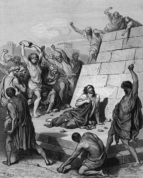 Слушая сие, они рвались сердцами своими и скрежетали на него зубами. Стефан же, будучи исполнен Духа Святаго, воззрев на небо, увидел славу Божию и Иисуса, стоящего одесную Бога, и сказал: вот, я вижу небеса отверстые и Сына Человеческого, стоящего одесную Бога. Но они, закричав громким голосом, затыкали уши свои, и единодушно устремились на него, и, выведя за город, стали побивать его камнями. Свидетели же положили свои одежды у ног юноши, именем Савла, и побивали камнями Стефана, который молился и говорил: Господи Иисусе! приими дух мой. И, преклонив колени, воскликнул громким голосом: Господи! не вмени им греха сего. И, сказав сие, почил. Савл же одобрял убиение его (Деян. 7:54-8:1).