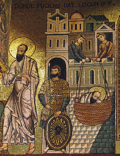 Христиане Дамаска помогают ап. Павлу бежать от иудеев. Мозаика Палатинской капеллы в Палермо, Сицилия. 1146–1151 гг.