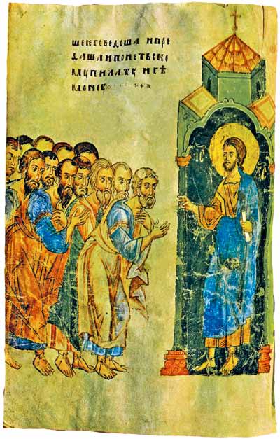 Отослание апостолов на проповедь. Миниатюра из Сийского Евангелия. 1390 г. (БАН. Арх. ком. 189. Л. 172 об.)