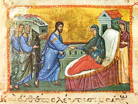 Придя в дом Петров, Иисус увидел тещу его, лежащую в горячке, и коснулся руки ее, и горячка оставила ее; и она встала и служила им (Мф. 8:14–15).