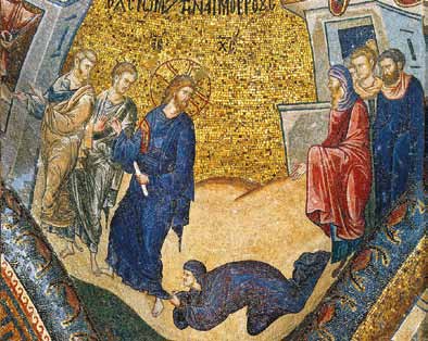 Исцеление Христом кровоточивой жены. Мозаика кафоликона монастыря Хора (Кахриеджами) в Константинополе. Ок. 13161321 гг.