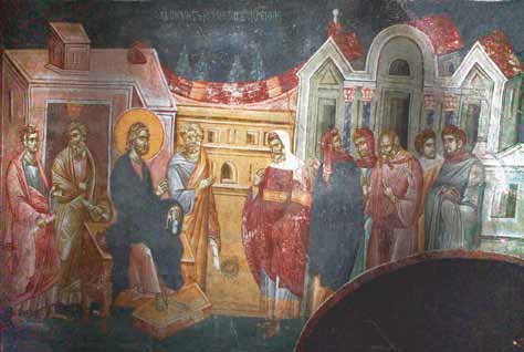 Христос проповедует фарисеям и книжникам. Фреска церкви Успения Пресв. Богородицы монастыря Грачаница, Сербия. Ок. 1320 г.